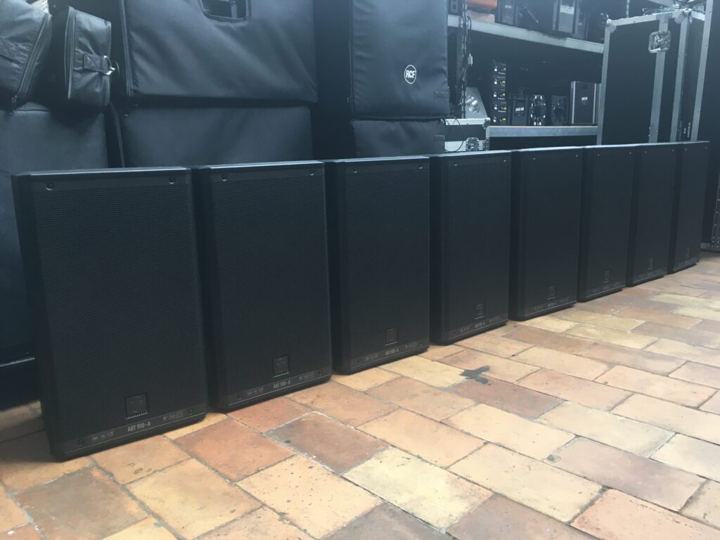8 enceintes RCF ART 910-A (1 050 watts RMS, 130dB, bi-amplification en classe D)